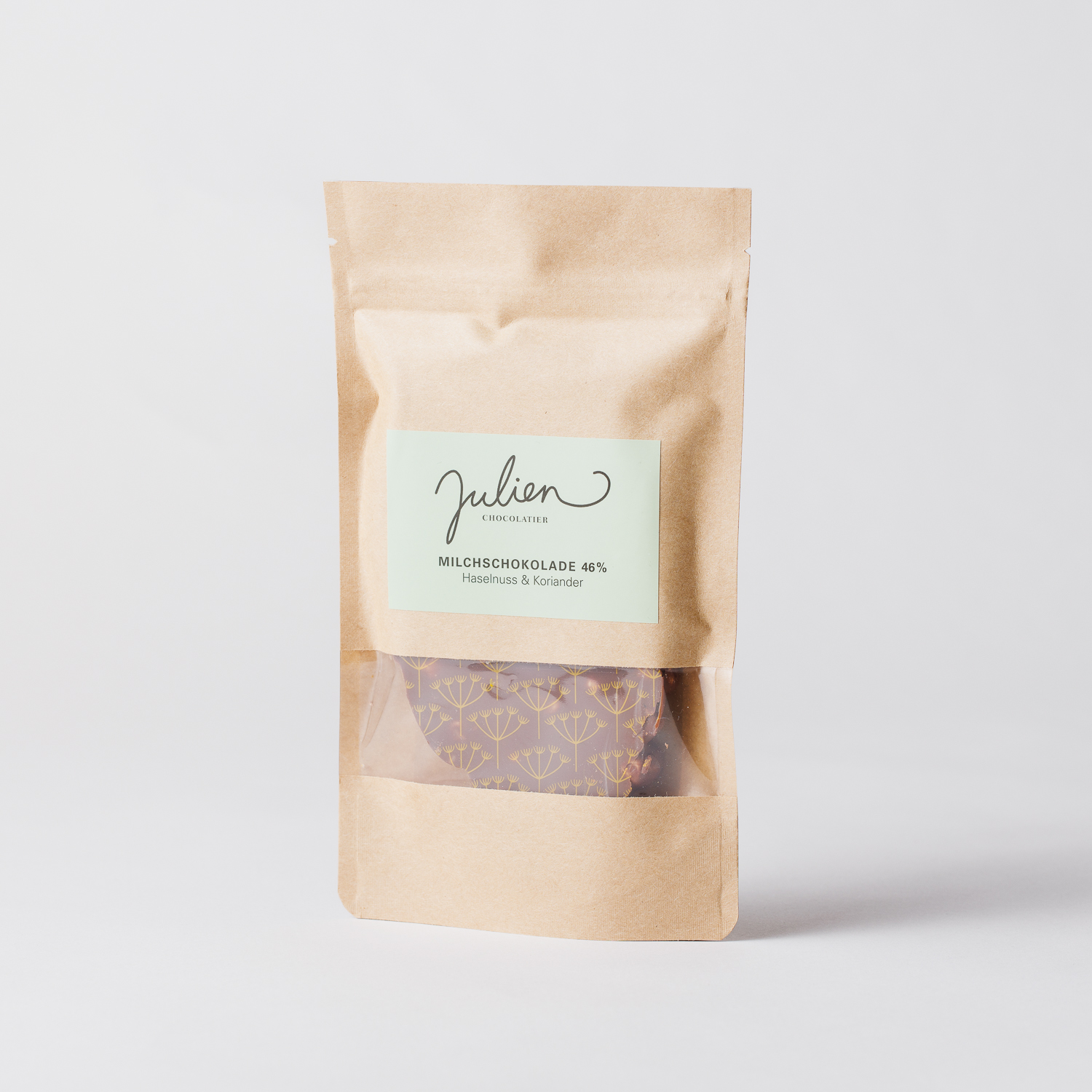 Ingredients: Milk chocolate 59.8% (Sugar, Cocoa butter, Whole milk powder, Cocoa beans 46%, Emulsifier Sunflower lecithin, Natural vanilla extract), Hazelnuts 37.4%, Sugar, Coriander 0.3%