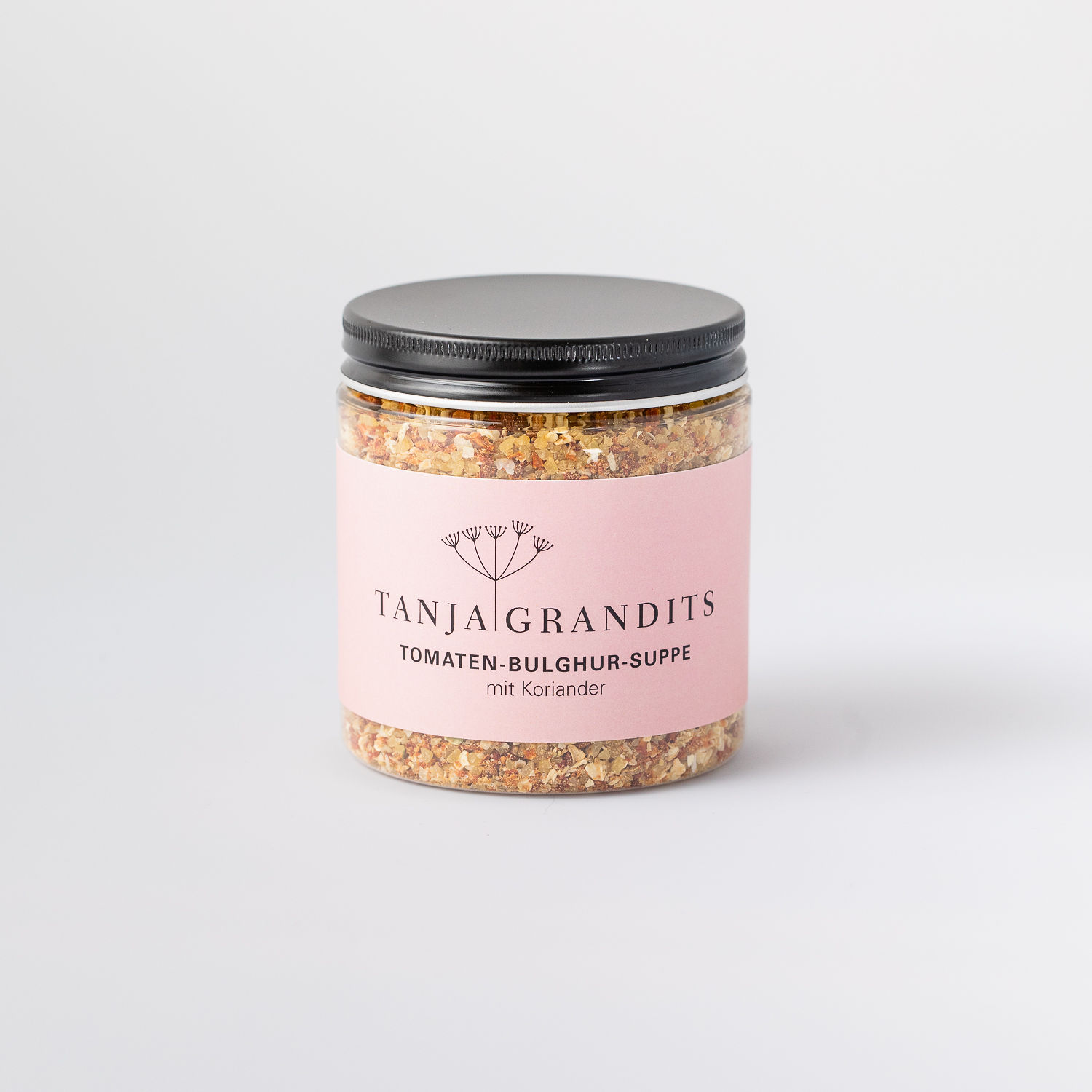 Ingredients: Bulghur (wheat) 50.8%, tomato flakes 14.1%, vegetable broth (sea salt, yeast extract, dried vegetables (pumpkin, carrot, parsnip, tomato), table salt, sugar, parsley, olive oil, spices (mace, bay leaf, white pepper, thyme, rosemary), onions, celery), coriander 3. 6%, tomato soup (tomato powder 48%, rice flour, sea salt, sugar, yeast extract, palm fat, olive oil, dried basil, pepper, lemon powder), salt, ginger, fennel, garlic, aniseed