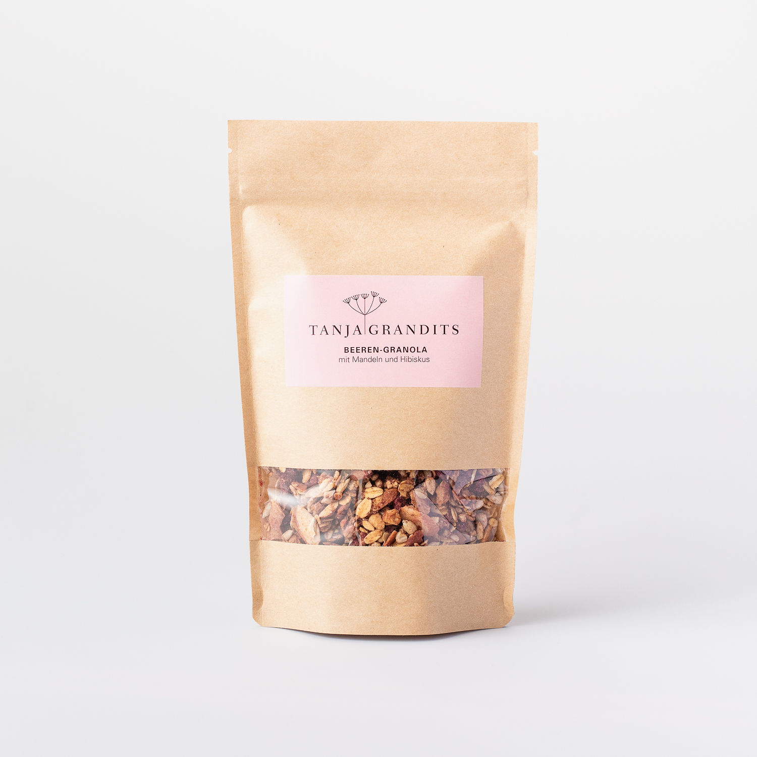 Zutaten: Haferflocken, Mandeln 22.8%, Sonnenblumenkerne, Agavensirup, Beeren 22.2% (Cranberries, Kirschen getrocknet, Blaubeeren getrocknet, Himbeer Krispy, Cassis Krispy), Zitronensaft, Kokoschips, Mandelöl, Zimt, Hibiskuspulver 0.5%, Zitronenpulver, Vanille, Fleur de Sel